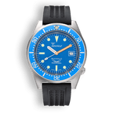 This Blue Blasted variant pairs the bead-blasted 316 L steel case with a matte blue dial and a black tropic-style rubber strap for pure retro tool-watch charisma.