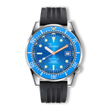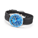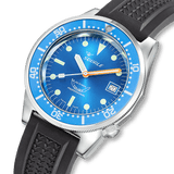 The Ocean version pairs a vibrant sun-ray blue dial with a black Tropic-style rubber strap and is water-resistant to 50 ATM, making it an ideal companion for professional and recreational diving.