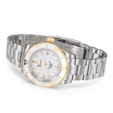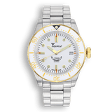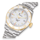 Born in the 1970s as a high-pressure case supplied by Squale to other brands, the “1545” has been revived as a modern 30-ATM dive watch that balances vintage charm with contemporary engineering. This White Bracelet variant contrasts a crisp white dial and ceramic bezel insert with gold-tone indexes, delivering maximum legibility above or below the surface.