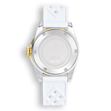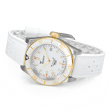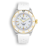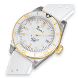 The “1545” line is Squale’s modern 30-ATM diver: a robust tool watch that keeps the brand’s vintage DNA alive while introducing contemporary colours and finishes. This White Rubber variant pairs a crisp white ceramic bezel with a matching Tropic-style strap for a fresh, summer-ready look, all driven by a Swiss automatic movement.