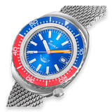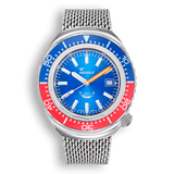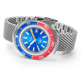 The Blue-Red variant pairs a vivid blue dial with a bi-colour sapphire bezel insert and comes on a robust stainless-steel Milanese mesh bracelet.