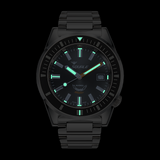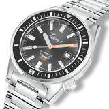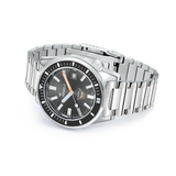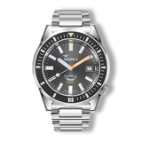 The “Matic” collection revives Squale’s distinctive 1970s cushion-case diver with modern engineering. This Grey edition combines a smoky dégradé dial, a mirror-polished 316 L steel case and a massive 60-ATM (600 m) depth rating, all while remaining faithful to the vintage aesthetic.