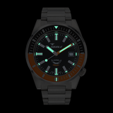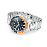 The “Matic” collection revisits Squale’s legendary cushion-case divers from the 1970s, adding a modern double-domed sapphire, a vibrant ceramic bezel and a professional 600-metre depth rating. The Satin Orange variant combines a bold matte-orange bezel with a stealthy black dial, offered here on a solid 316 L steel bracelet.
