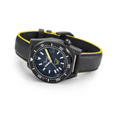 The “T-183” series combines Squale’s dive-watch heritage with cutting-edge forged-carbon technology. This yellow-accented edition features an ultra-light carbon case wrapped around an inner 316 L steel core and is rated to a formidable 60 ATM / 600 m.