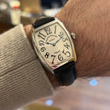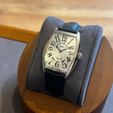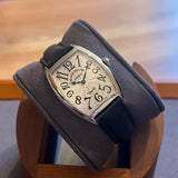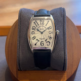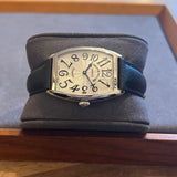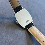 Diameter 29 mm x 39 mm. Stainless steel case. Smooth steel bezel. Crown with Franck Muller emblem. Guilloché silver dial with Arabic numerals. Blued hands. Sapphire crystal. Quartz movement. Solid steel case back with Franck Muller emblem. Off-brand black leather strap. Original Franck Muller pin buckle.