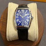Diameter 29 mm * 39 mm. Stainless steel case. Smooth steel bezel. Blue guilloché dial with arabic numerals. Luminous hands. Sapphire crystal. Quartz movement. Solid stainless steel case back with Franck Muller emblem. Black replacement leather strap non-original. Original Franck Muller stainless steel pin buckle.