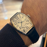 Diameter 40 mm * 32 mm. Stainless steel case. Smooth steel bezel. Silver guilloché dial with Arabic numerals. Blued hands. Sapphire crystal. Automatic movement. Solid stainless steel case back with Franck Muller emblem. Replacement black leather strap. Steel pin buckle engraved with Franck Muller.