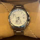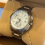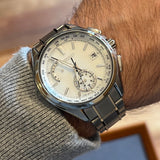 Diameter 43 mm. Wrist size 15.7 cm. Case and bracelet in titanium. Smooth titanium bezel. White dial without numerals. Luminous hands. Sapphire crystal. Solar quartz movement. Solid case back with Seiko emblem. Titanium deployant clasp with Seiko emblem.