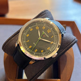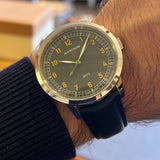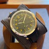Diameter 41 mm. Stainless steel case. Smooth stainless steel bezel. Green dial with Arabic numerals. Luminous hands. Sapphire crystal. Automatic movement. Transparent case back with stickers. Replacement black leather strap off-brand. JeanRichard pin buckle.