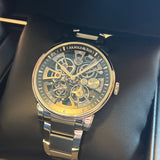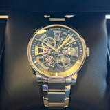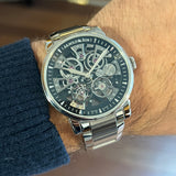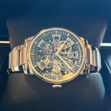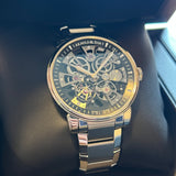 Diameter 40mm. Stainless steel case and bracelet. Smooth steel bezel. Skeleton dial. Sapphire crystal. Mechanical movement. Caliber A&S5201. Transparent case back. Stainless steel folding clasp with Arnold & Son emblem.