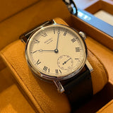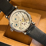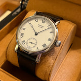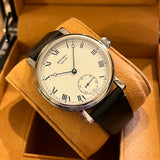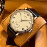 Diameter 43 mm. Thickness 12 mm. Stainless steel case. Smooth stainless steel bezel. White dial with Roman numerals. Blued hands. Sapphire crystal. Mechanical movement. Caliber 16 ½-6498. 48-hour power reserve. Transparent case back. Blue leather strap. Stainless steel pin buckle.