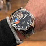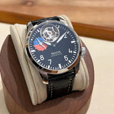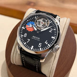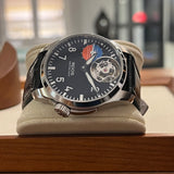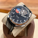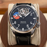 Diameter 43.5mm. Thickness 11mm. Stainless steel case. Black open-heart dial with Arabic numerals. Luminescent hands and markers. Sapphire crystal. Hand-wound mechanical movement. Transparent case back. Non original Epos black leather strap. Steel pin buckle with Epos emblem.