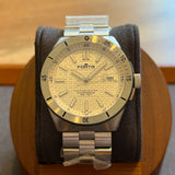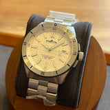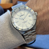Diameter 40 mm. Stainless steel case and bracelet. Graduated steel bezel. Textured white dial without numerals. Luminous hands and indexes. Sapphire crystal. Automatic movement. Solid stainless steel case back with sticker. Stainless steel folding clasp with sticker.