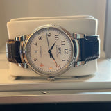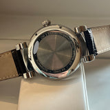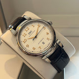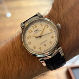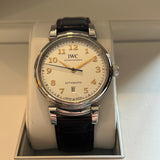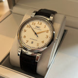 Diameter 40.4 mm. Thickness 10.2 mm. Stainless steel case. Smooth steel bezel. Silvered dial with Arabic numerals. Gold-plated hands and numerals. Blued central second hand. Sapphire crystal. Automatic movement. Caliber 35111. 42-hour power reserve. Solid steel case back with IWC emblem. Replacement brown leather strap not original IWC. Pin buckle with IWC emblem.