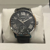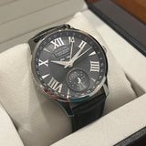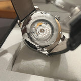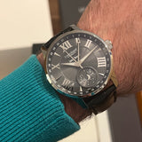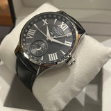 Diameter 44 mm. Thickness 12 mm. Stainless steel case. Smooth steel bezel. Silver dial with Roman numerals. Luminous hands. Sapphire crystal. Automatic movement. Transparent case back. Original black leather strap by Louis Erard. Double folding steel clasp with Louis Erard emblem.