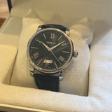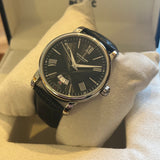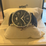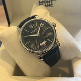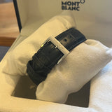 Diameter 42 mm. Stainless steel case. Smooth steel bezel. Montblanc crown. Black guilloché dial with Roman numerals. Luminescent hands and tips. Sapphire crystal. Automatic movement. Transparent case back with stickers. Black off-brand leather strap. Stainless steel pin buckle with Montblanc emblem.