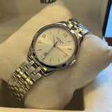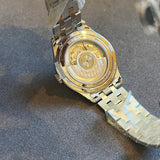 Diameter 38 mm. Wrist circumference 18.9 cm. Case and bracelet in stainless steel. Smooth steel bezel. Sunray silver dial with Arabic numerals. Gold-tone hands and indices. Sapphire crystal. Automatic movement. Transparent case back. Double folding steel clasp.