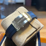 Diameter 44mm. Stainless steel case. Black graduated bezel. Blue dial with Arabic numerals. Luminous hands and indexes. Sapphire crystal. Automatic movement. Solid stainless steel caseback with sticker and Breitling emblem. Blue Breitling rubber strap. Stainless steel folding clasp with Breitling emblem.