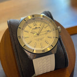 Diameter 40 mm. Steel case. Graduated bezel. White dial without numerals. Luminous hands and indexes. Sapphire crystal. Automatic movement. Solid steel caseback with Fortis emblem. White Fortis rubber strap. Steel pin buckle with Fortis emblem.