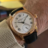 Diameter 42mm. Gold-plated steel case. Smooth gold-plated steel bezel. White dial with Roman numerals. Sapphire crystal. Automatic movement. Caliber FC-710. Transparent case back. Replacement black leather strap. Gold-plated steel folding clasp.