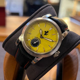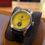 Diameter 37 mm. Stainless steel case. Smooth steel bezel. Ferrari crown. Yellow dial without numerals. Luminous hands. Sapphire crystal. Automatic movement. Solid stainless steel case back with Girard-Perregaux emblem. Replacement black leather strap, off-brand. Original stainless steel pin buckle.