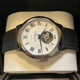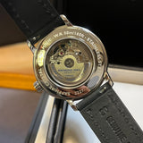 Diameter 39 mm. Stainless steel case. Smooth steel bezel. Silver dial with Roman numerals. Blued hands. Sapphire crystal. Automatic movement. Transparent case back. Black replacement leather strap (off-brand). Raymond Weil stainless steel folding clasp.