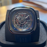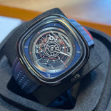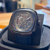 Diameter 45mm. Steel case with black coating. Smooth steel bezel with black coating. Skeleton dial with Arabic numerals. Luminous hands. Mineral crystal. Automatic movement. Solid steel caseback with SevenFriday emblem. Blue SevenFriday leather strap. SevenFriday steel pin buckle.