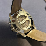 Diameter 43mm. Stainless steel case. Graduated steel bezel. Silver dial without numerals. Luminescent hands. Sapphire crystal. Automatic movement. Calibre 17RS. Transparent case back. Off-brand replacement black leather strap. Stainless steel folding clasp, TAG Heuer emblem missing.