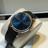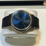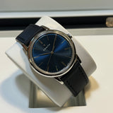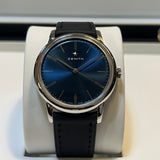 Diameter 39mm. Stainless steel case. Smooth stainless steel bezel. Blue dial without numerals. Sapphire crystal. Automatic movement. Transparent case back. Black leather replacement strap off-brand. Zenith stainless steel pin buckle.
