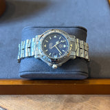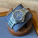 Diameter 38 mm. Wrist circumference of 17.6 cm. Case and bracelet in stainless steel. Graduated steel bezel. Tag Heuer crown. Blue dial without numerals. Luminous hands and indexes. Sapphire crystal. Automatic movement. Solid stainless steel case back with Tag Heuer emblem. Stainless steel folding clasp with Tag Heuer emblem.
