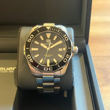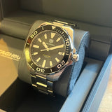Diameter: 41mm. Thickness 11.90 mm. Between lugs 20.5 mm. Waterproof up to 300 meters. Stainless steel case and bracelet. Sapphire crystal. Black sunray dial without numbers. Quartz movement. Black aluminum rotating bezel. Luminous indexes and hands. Solid box bottom screwed to the rear. Sapphire crystal. Screw-down crown with Tag Heuer emblem. Push-button folding clasp.