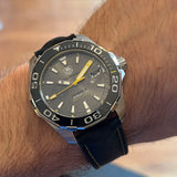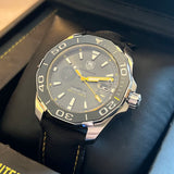 Diameter 41 mm. Stainless steel case. Gray dial without numbers. Sapphire crystal. Black ceramic rotating bezel. Original Tag Heuer strap in black nylon with yellow stitching. Tag Heuer simple steel folding clasp. Screwed solid case back. Crown with Tag Heuer emblem.