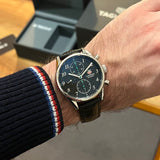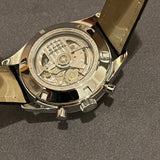 Diameter: 40 mm. Waterproof up to 100 meters. Stainless steel case. Black dial with Arabic numerals. New non-original black leather strap. Automatic movement. Transparent case back. Original deployant buckle. Sapphire crystal.