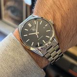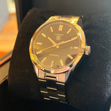 Diameter 39 mm. Wrist size 16.7 cm. Stainless steel case and bracelet. Smooth steel bezel. Black dial without numerals. Luminous hands and markers. Sapphire crystal. Automatic movement. Caliber Heuer 5. Transparent case back. Stainless steel folding clasp with Tag Heuer emblem.