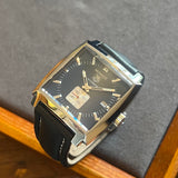 Diameter 37 mm x 37 mm. Stainless steel case. Blue dial without numerals. Luminous hands. Fixed steel bezel with Tag Heuer engraving. Sapphire crystal. Automatic movement. Caliber 5. 38-hour power reserve. Transparent case back. Non-original replacement black leather strap. Stainless steel folding clasp with Tag Heuer emblem.