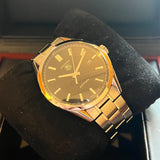 Diameter 39 mm. Wrist size 16.7 cm. Stainless steel case and bracelet. Smooth steel bezel. Black dial without numerals. Luminous hands and markers. Sapphire crystal. Automatic movement. Caliber Heuer 5. Transparent case back. Stainless steel folding clasp with Tag Heuer emblem.