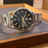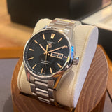 Diameter 41 mm. Thickness 13.08 mm. Between lugs 20 mm. Waterproof 100 meters. Stainless steel case and bracelet. Caliber 5 automatic movement. 38-hour power reserve. Frequency 28,800 Hz. Fixed steel bezel. Sapphire crystal. Black dial. Transparent screwed caseback. Steel crown with Tag Heuer emblem. Original Tag Heuer folding clasp.