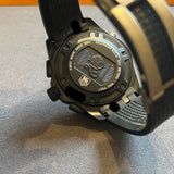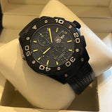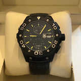 Diameter 44 mm. Case in grade 2 titanium coated with black PVD. Bezel with black rubber. Black dial without numbers. Luminous hands and markers. Sapphire crystal. Automatic movement. Caliber 16. Solid case back with Tag Heuer emblem. Black rubber strap by Tag Heuer. Titanium folding clasp with Tag Heuer emblem.