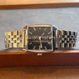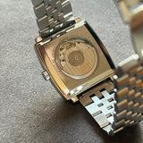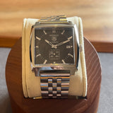Diameter: 37 mm. Stainless steel case. Smooth steel bezel. Brown dial without numbers. Luminous hands. Sapphire crystal. Automatic movement. Transparent case back. Replacement stainless steel bracelet, not original. Replacement steel folding clasp, not original.