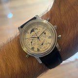 Functions: Hours, minutes, chronograph, moon phase, day, date, and month display.