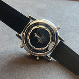 Diameter 38 mm. Stainless steel case. Smooth steel bezel. White dial with Roman numerals. Quartz chronograph movement. Solid stainless-steel case back with Tenshodo emblem. Replacement black leather strap non-original. Replacement steel pin buckle non-original.