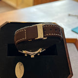 Diameter 37 mm. Stainless steel case. Graduated steel bezel. White dial with Arabic numerals at 12 o'clock. Luminescent hands and markers. Sapphire crystal. Automatic movement. Solid stainless steel case back with Breitling emblem. Non-original replacement brown leather strap, not Breitling. Stainless steel folding clasp with Breitling emblem.