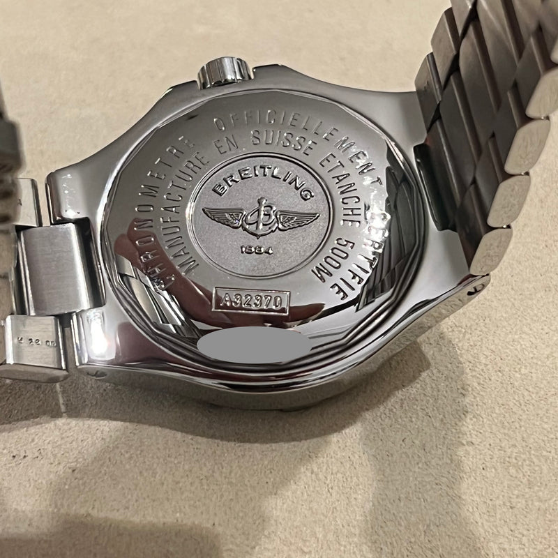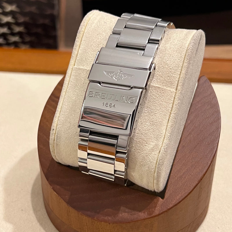 Diameter 41 mm. Stainless steel case and bracelet. Graduated stainless steel bezel. Blue dial with Arabic numerals. Luminescent hands. Sapphire crystal. Automatic movement. Solid stainless steel case back with Breitling emblem. Stainless steel deployment clasp with Breitling emblem.