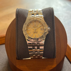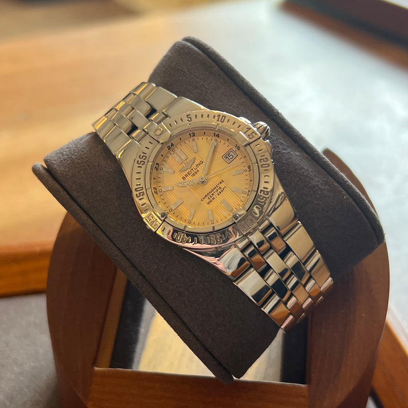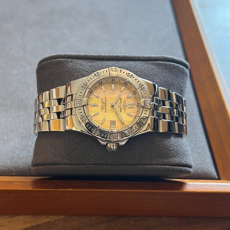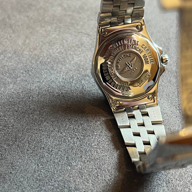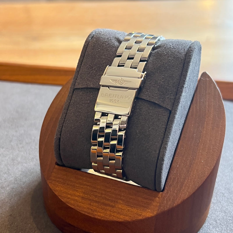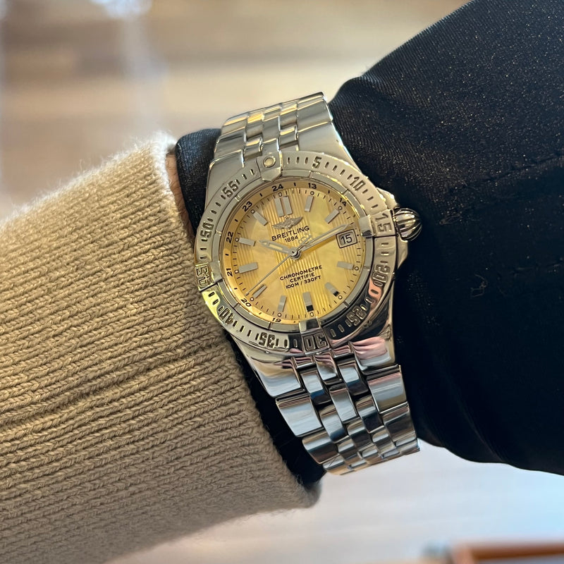 Diameter 30 mm. Wrist circumference of 16.5 cm. Case and bracelet in stainless steel. Graduated steel bezel. Breitling crown. Mother-of-pearl dial without numerals. Luminous hands and markers. Sapphire crystal. Quartz movement. Solid steel case back with Breitling emblem. Steel deployment clasp with Breitling emblem.