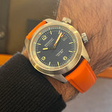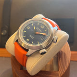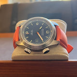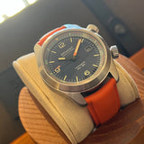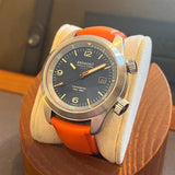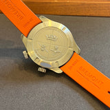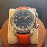 Diameter: 42 mm. Stainless steel case. Smooth steel bezel. Black dial with Arabic numerals. Luminous hands and markers. Sapphire crystal. Automatic movement. Caliber 11 1/2 BE-92AV. Power reserve of 42 hours. Stainless steel case back with Bremont emblem. Original Bremont orange rubber strap. Stainless steel pin buckle with Bremont emblem.