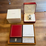 Diameter 28 mm * 36 mm. Wrist circumference without additional links 15.8 cm. Stainless steel case and bracelet. Smooth steel bezel. Ivory dial with Roman numerals. Blued hands. Sapphire crystal. Quartz movement. Solid steel case back with Cartier emblem. Original Cartier double folding clasp.