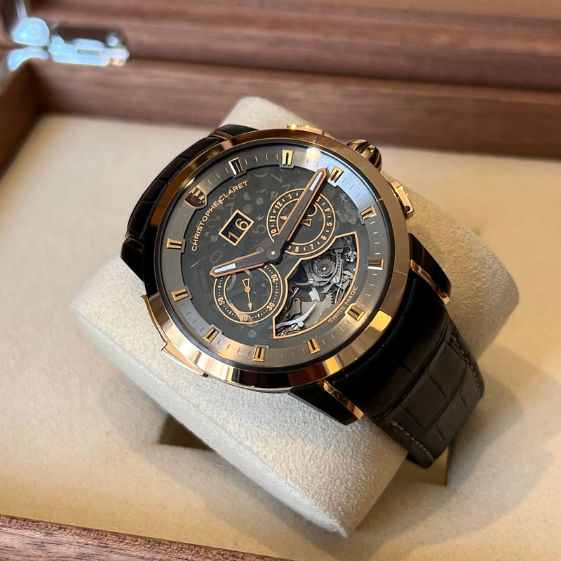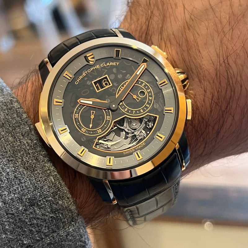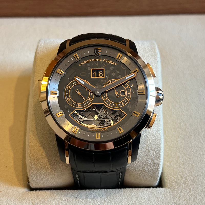 Christophe Claret is a manufacturer specializing in highly complicated watches, particularly tourbillons, repeaters, chronographs, split movements, and perpetual calendars. Claret launched his own company in 1986 and began supplying exclusive movements and watches to other high-end brands in the following years. In 1987, Ulysse Nardin became the first major client with an order for 20-minute repeater movements. Other clients include Breguet, Cartier, Chopard, Corum, de Grisogono, Franck Muller, Girard-Perregaux, Harry Winston, and Parmigiani.