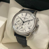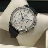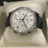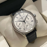 Diameter: 42 mm. Stainless steel case. Smooth steel bezel. Textured silver dial with Roman numerals. Blued hands. Sapphire crystal. Automatic chronograph movement. Transparent case back. Non-original replacement blue leather strap. Stainless steel deployant clasp with Frédérique Constant emblem.