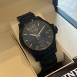 Diameter 41 mm. Wrist size 16.3 cm. Case and bracelet in steel and black PVD. Textured blue dial with Arabic numerals. Luminous hands and indexes. Sapphire crystal. Quartz movement. Caliber L288. Solid steel case back with Longines emblem. Double folding clasp in black PVD steel with Longines emblem.