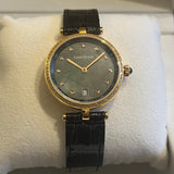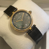 Diameter 33 mm. Gold-tone steel case. Bezel set with natural diamonds. Mother of pearl dial. Indices set with natural diamonds. Sapphire crystal. Quartz movement. Solid gold-tone steel case back with Louis Erard emblem. Original Louis Erard black leather strap. Gold-tone steel double-folding clasp with Louis Erard emblem.